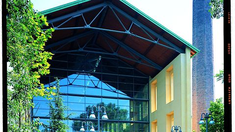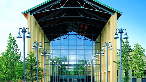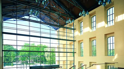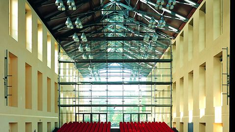This single-nave basilican building envelope is characterised by a classical organisation of functions. The entrance hall, generously apportioned steps, auditorium and stage are all set under a braced gable roof. Two inset glass façades provide a climatic filter to the outside and emphasise the transition from interior to exterior. This is further reinforced by the rows of windows on either side of the building.