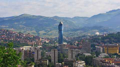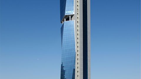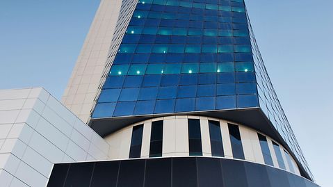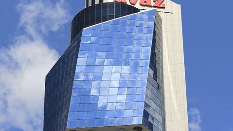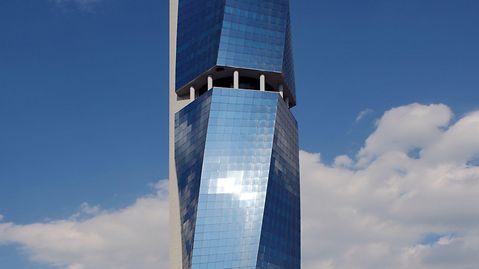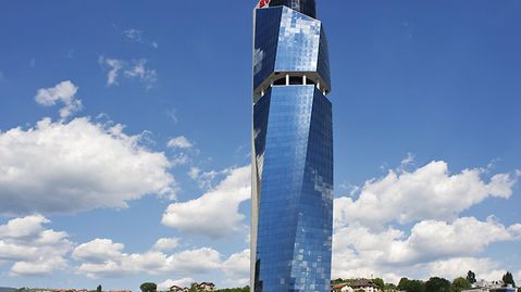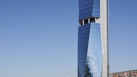 This skyscraper in Sarajevo, the capital of Bosnia-Herzegovina, is the tallest tower block in South-East Europe. It is 142 metres in height, spanning 38 floors. There is a 30-metre mast at the very top. Most striking is that the blue building structure, which leans against a plainly vertical component, seems to revolve. Here, in the coloured façade section with solar shading glass, horizontal caesurae have been added, creating the impression of the structure being stretched. The surface of the sinuous component that rises skyward is thus designed to appear imbricative. The connective centre forms a central axis with steps up to the top, which is crowned by the antenna.