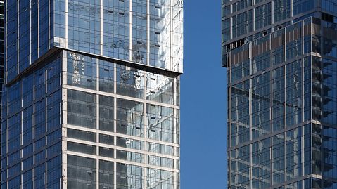 The architectural idiom of pure geometrical shapes is rooted in 20th century Russian Constructivism, which consciously used art and architecture to convey information. The orthogonal towers consist of stacked cubes twisted in relation to one another on a vertical axis. The cubic floor plans allow for a generous spatial design as well as extremely efficient building technology. The twisting breaks up the geometric rigidity, making the skyscrapers more dynamic. Schüco aluminum façade systems were used for the façade. Vertical strips alternating with light and dark panels stress the partially flush shiny glass elements. The large module widths and installation heights created by using the thermally insulated façade system, Schüco FW 60+, afford the residents magnificent views of the river, the glamorous business center, and the historic city center.