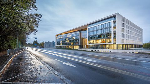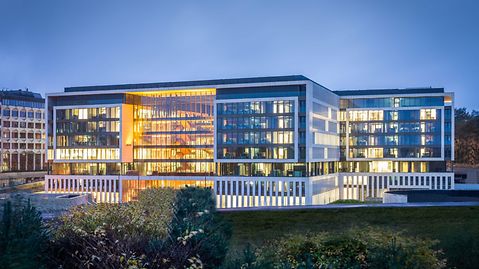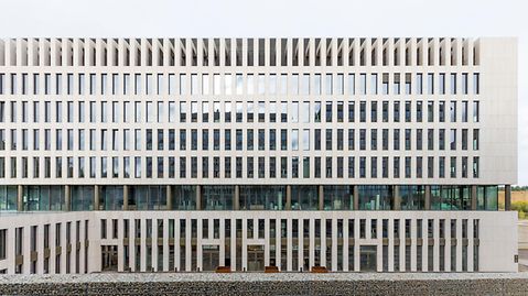 The new global headquarters of Ferrero houses work spaces for 1200 employees in a single building that were previously spread across five different sites. The concept plays on the idea of an Italian piazza, with a number of terraces overlooking the atrium of the two multi-storey offce wings. The sections of the building are connected by a series of walkways, while glass panoramic lifts facilitate travel between floors. The city within a city spans nine storeys and includes offce spaces, restaurants, fitness suites and multipurpose spaces, as well as parking. Custom profiles set the offce façades apart, with a flat face on the inside of the building and a slight relief effect on the outside to create the impression of continuous glass ribbons. A steel construction was used for the oversized glass façade at the main entrance due to its load-bearing capacity.