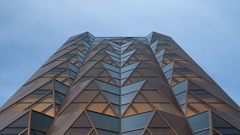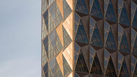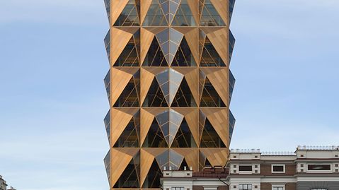 Whenever Yekaterinburg is mentioned, someone inevitably makes a reference to the execution of the Russian Imperial Romanov family in 1918. In 2003, the imposing Church on the Blood was built at the site of the shooting and quickly became a new landmark for the city with its golden domes. Just a few hundred metres south of this is the no less impressive, new headquarters of the Russian Copper Company, one of the world's top producers of copper. Designed by Foster + Partner, the 90 metre-high, 15-storey building offers a modern, open offce space consisting of individual modules each containing two offces stacked on top of one another. The main feature of the newbuild is the 12,500 m2 unitised façade with ist pyramid-shaped modules made from glass and copper-coloured steel, each measuring six metres wide and up to 12 metres tall. The size of the individual modules follows the double- level structure of the offce units.
