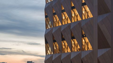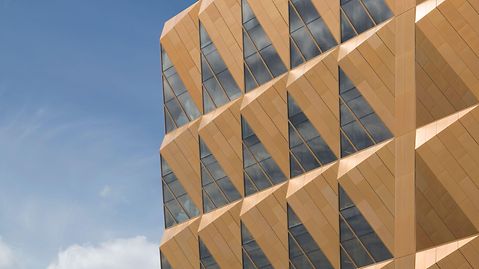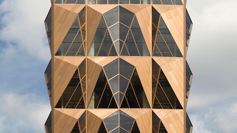 Their crystalline structure consisting of four triangles reflects the company's corporate identity and the molecular composition of copper. However, it was primarily developed in view of the huge temperature fluctuations throughout the year, which sometimes sink to -40°C. In order to ensure optimum lighting and climate control in the interior, only two of the four triangles are made from glass, with copper-coloured steel being used for the others. An eye-catching grid of individual »pyramids« has therefore been created, the sides of which provide sun shading to shield the high summer sun, while the low winter sun can still warm the building. Priedemann Facade Experts architectural practice was involved during the concept phase, in order to translate the strict geometric specifications into a feasible parametric design. »One of the biggest challenges was the requirement to use local resources as far as possible, along with a local company to build the façade,« explains project manager Thomas Eschenbach. For the entire shell, 250 units were used in total with 50 different variations and each weighing around ten tonnes, and these all needed to be calculated individually. »The limited load-bearing capacity of the crane used means that we had to restrict the weight of the pre-installed units to seven tonnes,« explains Thomas Eschenbach. The copper-coloured stainless steel sheets and the internal aluminium cassettes could only be installed on the building site. Despite all these challenges, the project was completed on time in September 2020.