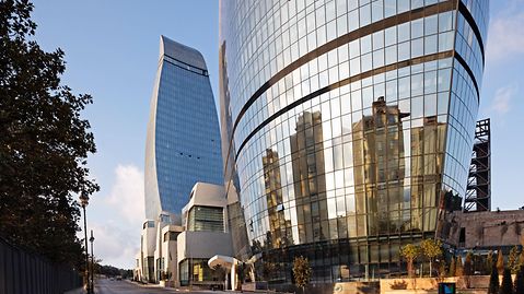 The state of Azerbaijan, which has been independent since 1991, has a wealth of crude oil and natural gas reserves and is therefore a major exporter of these resources. This position of dominance is symbolised by the three Flame Towers in Baku, the capital city of the country on the Caspian Sea. Visible for miles around, the three skyscrapers soar above the town centre and harbour like flickering flames. The tower positioned to the south, the tallest of the three, has 39 storeys and houses 130 luxury apartments, with spectacular views of the land and sea guaranteed. Positioned to the north is the 36 storey hotel tower of the Canadian operator Fairmont. The office tower, comprising more than 33,000 m² of prime real estate, is situated to the west of the complex. All three structures “stand” on a single base, which accommodates a shopping and service centre open to both visitors and users of the buildings. A pre-fabricated modular panel façade was used for the glass, amorphous-shaped building envelopes, which enabled quick installation on site.