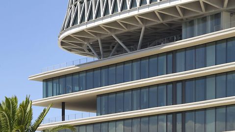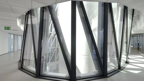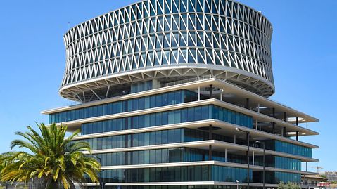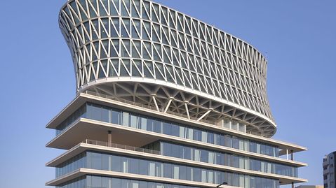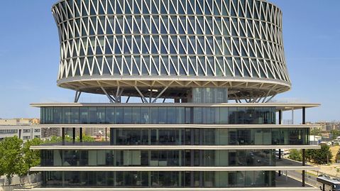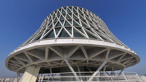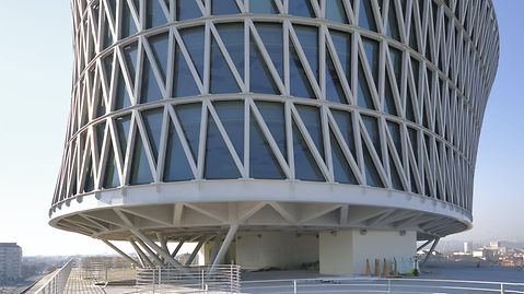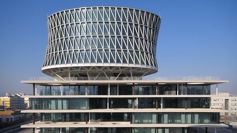 The Italian architect Massimiliano Fuksas has once again created something truly distinctive. The building demonstrates a dynamic interplay between two completely different building structures. The Polo Direzionale De Cecco consists of a six-storey, quadratic cube with overhanging balconies and the reticular radial component elevated above. The balconies at the base have punched openings, offering a plethora of surprising views. They also serve to improve communication in the working environment. The horizontal, stationary base structure and its aspiring radial top represent values such as knowledge and experience, coupled with innovation. This gives the construction a beautifully composed duality.