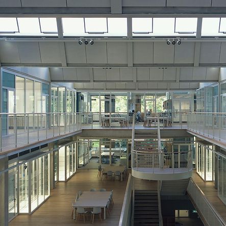 An in-situ concrete frame and slender steel work support inclined ribbed precast concrete roof slabs, reflecting daylight into spaces below. Schüco Jansen steel systems were key to achieving transparency and performance demands, while integrating innovative bespoke features. Consistency of the sections gives a coherent appearance throughout, despite differing performance requirements.