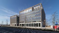 Solar gain is controlled using the deep aluminium sections on the façade and solar control glass in the window units. Renewable electricity comes from roof-mounted PV panels.
