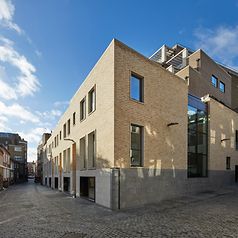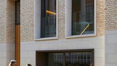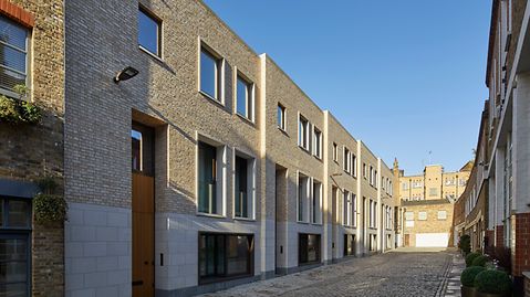 Fabricated by Propak Architectural Glazing ltd, Schüco Jansen Janisol Arte profiles were chosen for the entrance double doors, complementing the 1930s façade. An underfloor, automatic pivot opening system allows the doors to be access controlled and meet the requirements of Lifetime Homes. Handrolled and patinated bronze sheeting is used as part of an elegant anti-finger-trap detail. Behind the street frontage, a series of terraced apartments step down to meet a row of townhouses lining the mews.