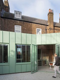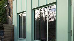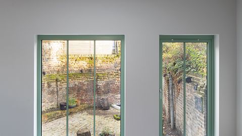 The Saddlery is a light-filled garden room spanning the width of a Grade II listed house in London. Designed by Studio Octopi, the single-storey extension doubles as a new entrance from the street and links the garden, upper-ground and lower-ground floor levels. The pistachio-coloured steel cladding is intended to complement the existing red brick façade, while clearly distinguishing the old and new elements. This is carried through to the Schüco systems with the vertical cladding seams neatly aligning with the door and window mullions.