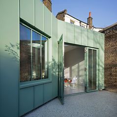 The Saddlery is a light-filled garden room spanning the width of a Grade II listed house in London. Designed by Studio Octopi, the single-storey extension doubles as a new entrance from the street and links the garden, upper-ground and lower-ground floor levels. The pistachio-coloured steel cladding is intended to complement the existing red brick façade, while clearly distinguishing the old and new elements. This is carried through to the Schüco systems with the vertical cladding seams neatly aligning with the door and window mullions.