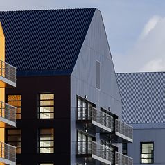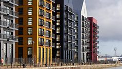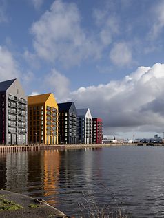 Millers Quay forms part of the Wirral Waters Masterplan, and comprises six 10-storey buildings accommodating 500 apartments. Designed by Howells, the development references the historic Birkenhead Docks, drawing inspiration from colourful metalwork, shipbuilding graphics, and steel-clad warehouses. A strong linear composition and distinctive roof profiles evoke heritage wharf architecture, while carefully orientated building footprints ensure each home has a view of the water and excellent daylighting.