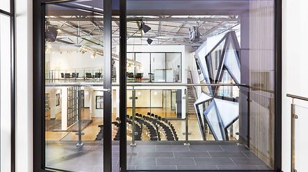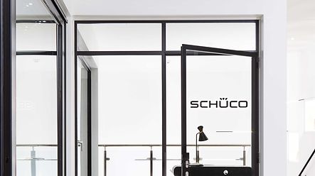 The showroom showcases samples of Schueco façades, windows, sliding doors and entrance doors. In addition to the elaborate exhibit and event area, the showroom also presents itself as design-support office.